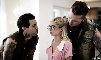 Puny blonde in glasses Piper Perri gets facial after hardcore gangbang