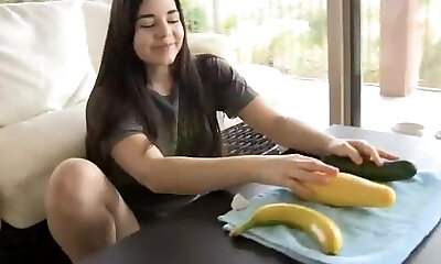 Naughty Nadine masturbates with trio different fruits