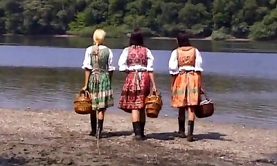 诱人的femmes与全天然牛奶罐得到捣烂奇闻趣事在海滩在一个有吸引力的组嬉戏