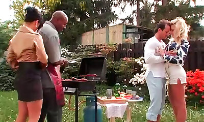 烧烤派对变成一个超热气腾腾的组与性感的旋钮口渴的馅饼